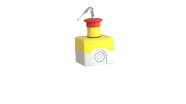 Pulsante di arresto di emergenza montaggio superficiale, configurazione 1NO + 2NC, attuazione a pulsante con rilascio a chiave, serie Harmony XALK. Grado di protezione IP69K, temperatura operativa da -40 a +70 gradi Celsius, tensione nominale 600V, dimensioni 68x68x53 mm, materiale cornice e pulsante in policarbonato, colore rosso/giallo. Durata meccanica 300000 cicli, fusibile a cartuccia 10A per protezione cortocircuiti.