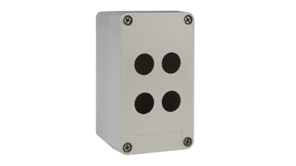 Scatola per pulsante Schneider Electric, 4 fori, diametro 22mm. Materiale: poliestere rinforzato con fibra di vetro, colore coperchio grigio scuro/base grigio chiaro. Temperatura di esercizio: -25 a 70 gradi Celsius. Serie Harmony XAP, senza marcatura. Dimensioni compatte, progettata per applicazioni industriali.