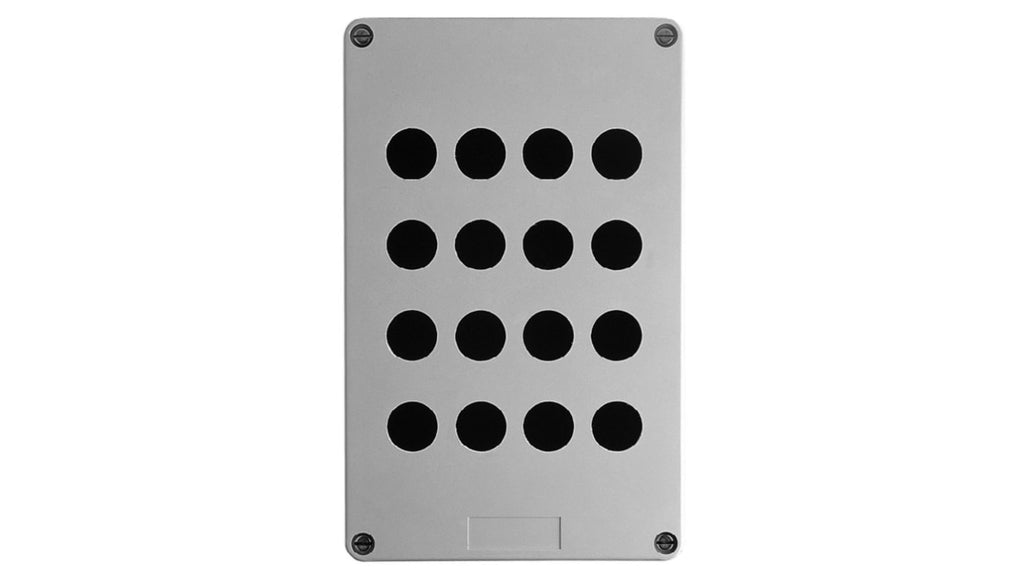 Contenitore stazione di controllo Schneider Electric, realizzato in poliestere rinforzato con fibra di vetro, 16 fori di diametro 22mm disposti in 4 colonne, colore grigio, protezione contro il contatto accidentale, marcatura assente. Codice costruttore XAPA4116.
