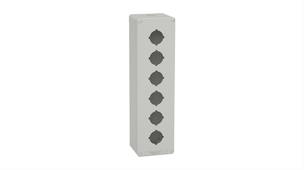 Stazione di controllo vuota Harmony Schneider Electric, filettatura M32 x 1,5, 6 fori da 30 mm, materiale in alluminio pressofuso, colore grigio, dimensioni 80 x 310 x 77 mm, grado di protezione IP65.