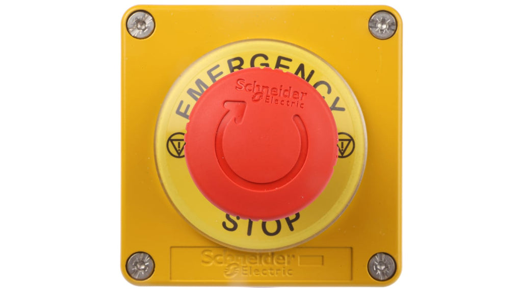 Stazione di controllo per pulsante Schneider Electric, pulsante di arresto di emergenza, serie Harmony XAP, diametro foro 22mm, 1 foro, materiale lega di zinco, grado di protezione IP65, dimensioni 80 x 80 x 51mm, temperatura operativa da -25 a +70 gradi Celsius, colore giallo con marcatura "Arresto di emergenza", montaggio a pannello, compatibile con unità di controllo e segnalazione.