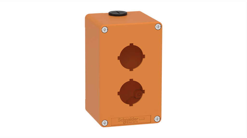 Stazione di controllo vuota Harmony Schneider Electric, filettatura M20 x 1,5, 2 fori da 30 mm, materiale in lega di zinco, colore arancione, dimensioni 80 x 130 x 77 mm, grado di protezione IP65.