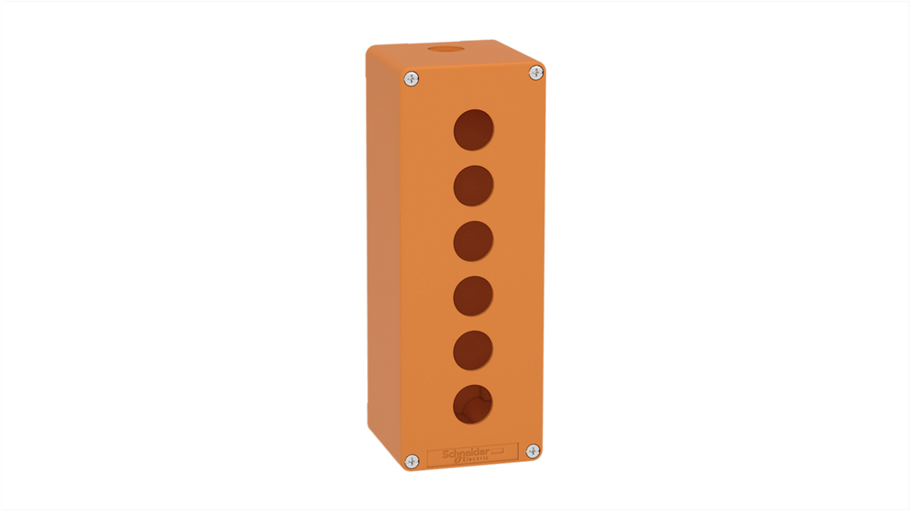 Stazione di controllo vuota Harmony Schneider Electric, filettatura M25 x 1,5, 6 fori da 22 mm, materiale in lega di zinco, colore arancione, dimensioni 80 x 220 x 77 mm, grado di protezione IP65.