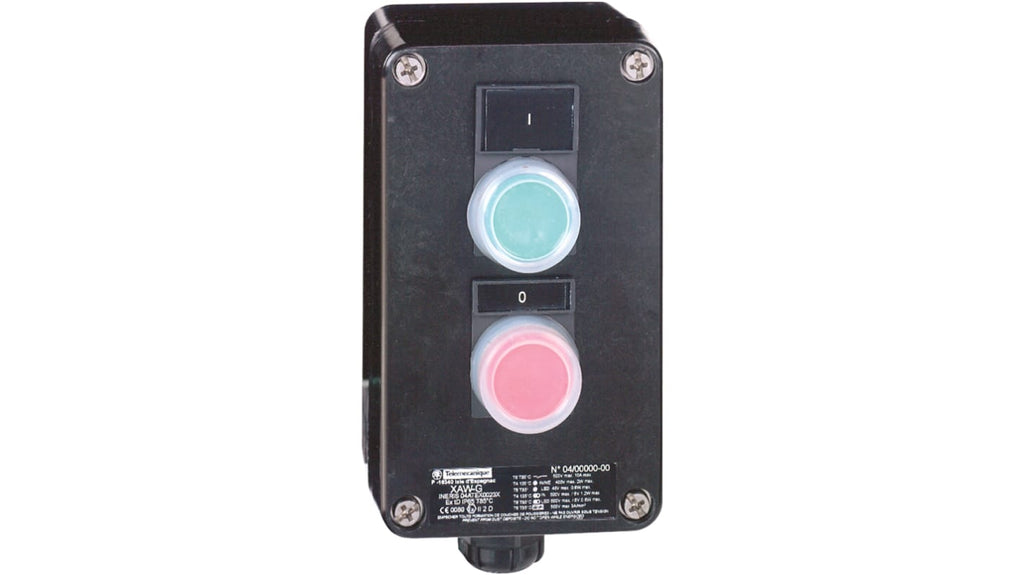 Pulsante di controllo Schneider Electric, IP65, modello XAWF210EX, a 2 fili, funzione di arresto, colore verde e rosso, materiale metallico, configurazione contatto 1 NA + 1 NC, ritorno a molla, grado di protezione IP65, temperatura operativa da -20°C a +60°C, dimensioni 80mm x 77mm, contenitore nero, tipo ATEX.