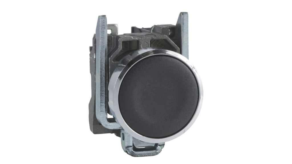 Pulsante industriale rotondo Schneider Electric, 22 mm, colore nero, configurazione 1 NC, tensione nominale 600V. Struttura in metallo resistente, meccanismo di ritorno a molla, superficie non contrassegnata per personalizzazione. Grado di protezione IP66, IP67, IP69, conforme a IK06 e norme CEI 50102. Prodotto senza mercurio, conforme RoHS, esente da metalli pesanti tossici. Serie XB4.