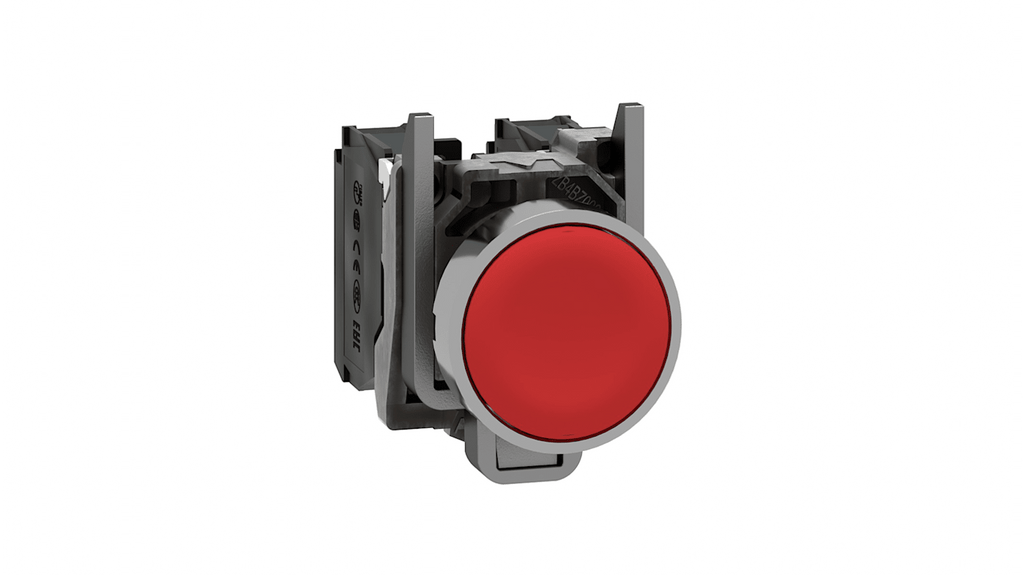 Pulsante a filo rosso, attuazione a pulsante con ritorno a molla, diametro di montaggio 22,5 mm, lunetta in metallo cromato, collare di fissaggio in zama, contatti in lega d'argento. Serie Harmony XB4, progettato per applicazioni industriali, offre alta resistenza e prestazioni affidabili. Marchio Schneider Electric, codice costruttore XB4BA45.