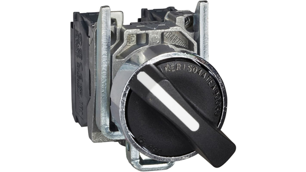 Selettore a 3 posizioni Schneider Electric XB4BD33EX, diametro 22 mm, angolo di corsa 45 gradi, operatore Stay put, 2 contatti normalmente aperti, grado di protezione IP65, cornice in metallo cromato, ATEX. Non illuminato, unità completa selettore.