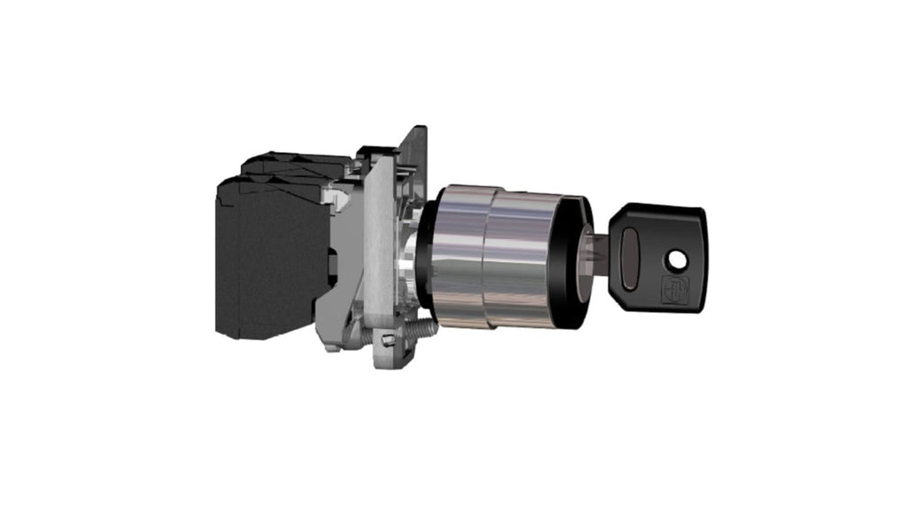 Interruttore a chiave con ritorno a molla, 2 posizioni, 1NO, protezione IP65, materiale in metallo cromato, contatti in lega d'argento, terminali a vite. Tensione nominale 600V, temperatura operativa da -20 a +60 gradi Celsius, durata meccanica 3000000 cicli. Codice costruttore XB4BG61EX, marchio Schneider Electric.