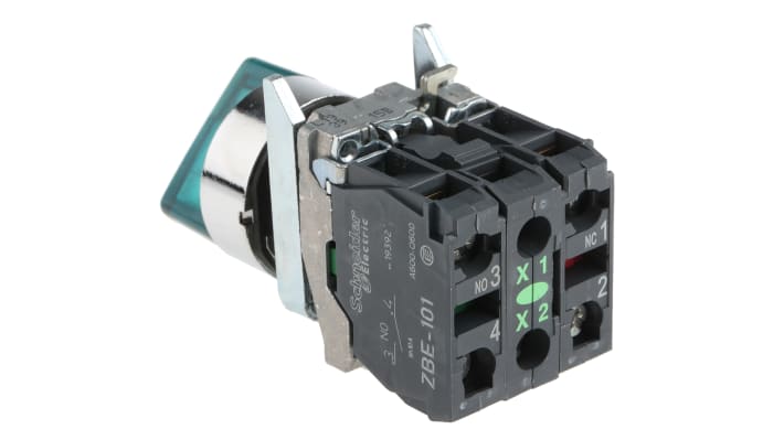 Selettore rotante a 2 posizioni Schneider Electric, 600 V c.a./c.c., serie Harmony XB4. Attuatore con impugnatura standard verde, angolo di corsa 90°, corrente massima 1,2 A, tipo terminale a vite. Cornice in metallo cromato, collare in Zamak resistente agli urti, LED integrato per identificazione. Durata utile 100.000 ore, diametro di montaggio 22 mm. Applicabile a azionamenti c.a./c.c. e linee di assemblaggio automatizzate.