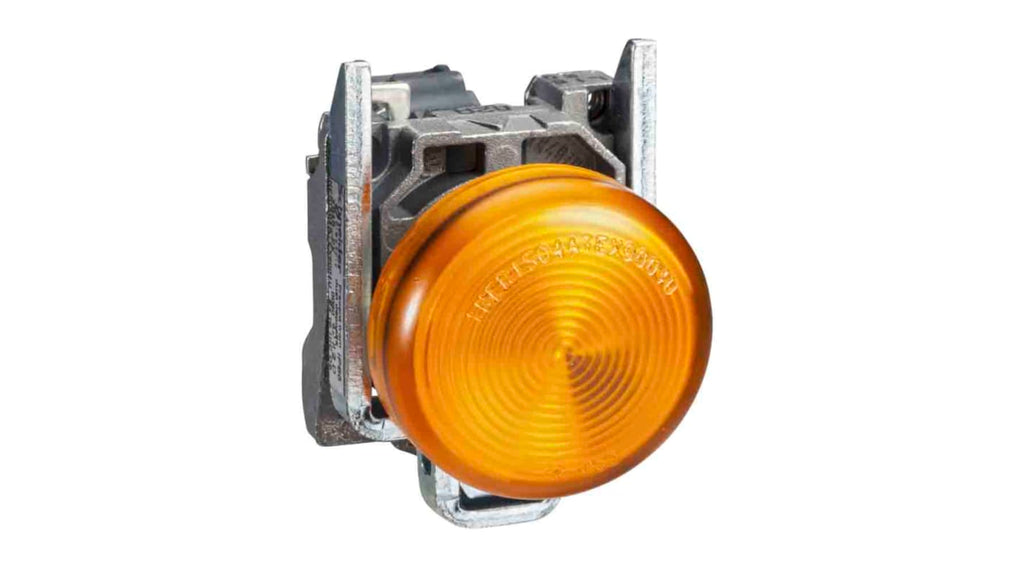 Luce pilota completa LED, foro 22mm, grado di protezione IP40 e IP65, tensione nominale 24V, corrente nominale 18mA, colore giallo, morsetti a vite, progettata per un utilizzo senza manutenzione, serie Harmony XB4, marchio Schneider Electric. Mercury free.