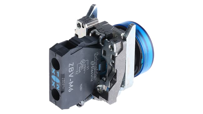 Spia LED universale, montaggio a pannello, diametro foro 22 mm, tensione nominale 240V ca, colore blu, tipo lampada LED, tipo terminale a vite, materiale corpo metallico, serie Harmony XB4, resistenza vibrazioni, protezione dagli urti IK06, temperatura operativa da -40 a 70 gradi, grado di protezione fino a IP66, conformità a IEC, UL, CSA, CCC, EAC, JIS, certificato ATEX.