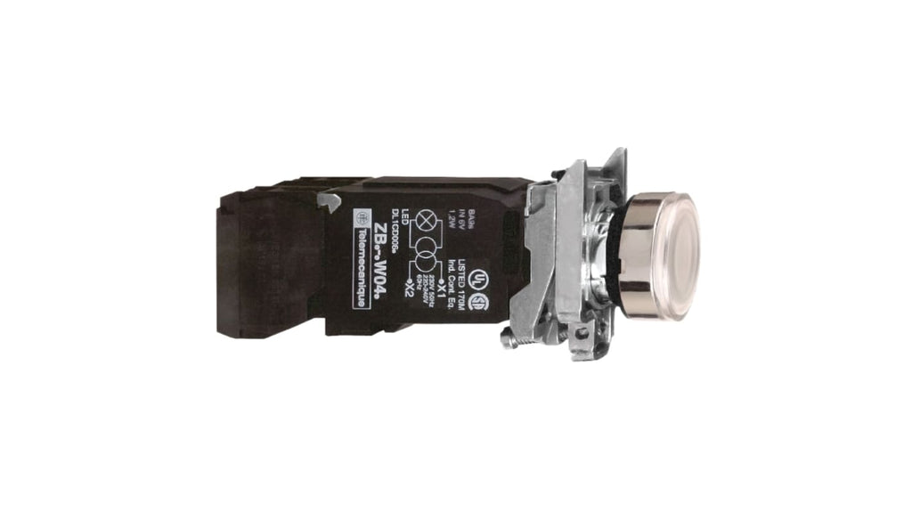 Pulsante modulare illuminato, meccanismo di ritorno a molla o a impulsi, tensione nominale 110-120V, diametro forature 22 mm, colore argento, cornice in metallo, protezione IP66, IP67, IP69, temperatura d'esercizio da -40 a 70 gradi Celsius, resistente a urti, polvere, acqua e vibrazioni, collegamenti a vite. Codice costruttore XB4BW3135, marchio Schneider Electric.