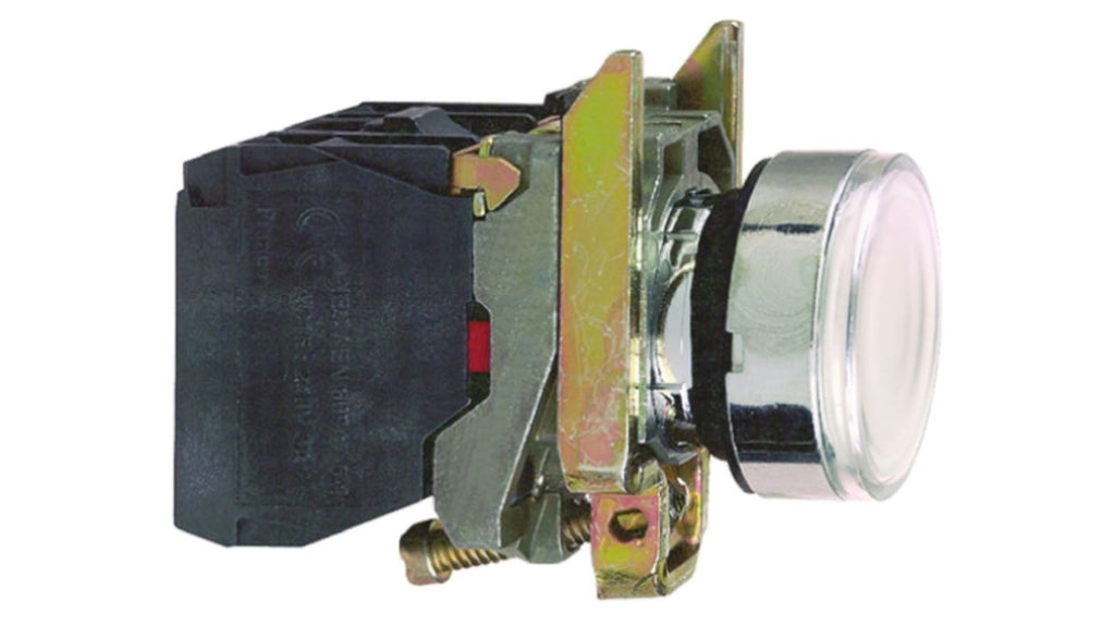 Pulsante luminoso montaggio a pannello, configurazione SPDT, diametro foratura 22 mm, colore bianco, sorgente LED integrata, grado di protezione IP 67, 69 e IP 69 K, resistenza a temperature da -25 a +70 gradi Celsius, 1.000.000 cicli di durata meccanica, contatti a vite, conforme a EN/IEC 60947-5-1, UL 508 e CSA C22.2 N. 14. Codice produttore XB4BW31G5, serie Harmony XB4.