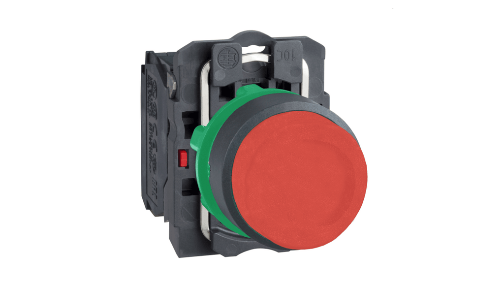 Pulsante SPST per montaggio a pannello, codice XB5AL42, marchio Schneider Electric. Diametro foratura pannello 22 mm, colore rosso, contatto a rottura lenta, terminale a vite. Resistenza meccanica 10.000.000 cicli, temperatura operativa da -25 a +70 gradi Celsius. Grado di protezione IP 66, IP 69K, NEMA 4X e 13. Conforme a EN/IEC 60947-5-1, UL 508. Utilizzabile in ambienti industriali e commerciali.