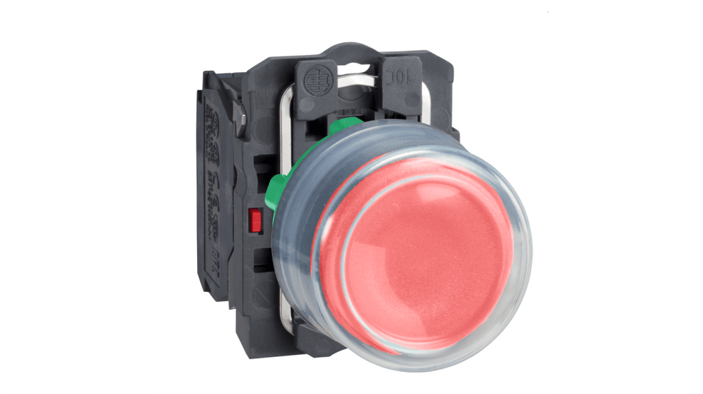 Pulsante SPST per montaggio a pannello, grado di protezione IP66 e IP67, diametro foratura 22mm, colore rosso, contatto a vite, resistenza meccanica 10 milioni di cicli, temperatura operativa da -25 a 70 gradi Celsius, conforme a EN/IEC 60947-5-1 e UL 508, materiale plastico, serie Harmony XB5, codice produttore XB5AP42.