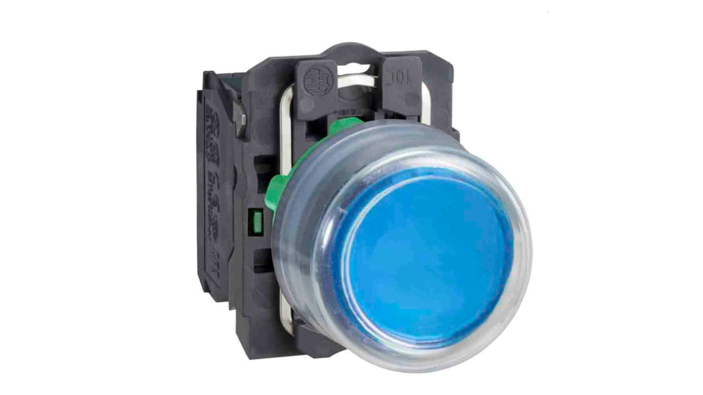 Pulsante modulare blu con protezione in silicone trasparente, meccanismo di ritorno a molla/a impulsi, morsetti a vite, resistente agli urti, alla polvere, all'acqua e alle vibrazioni, diametro foratura pannello 22 mm, configurazione contatto SPST, tipo di pulsante rotondo, serie Harmony XB5, codice produttore XB5AP61, mercury free.