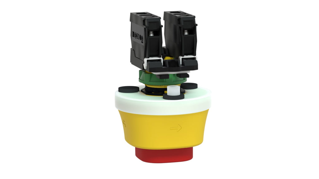 Pulsante di arresto di emergenza montaggio a pannello, diametro 22mm, configurazione contatto SPDT, attuazione a pulsante, rilascio a rotazione, illuminato, tensione nominale 24V ac/cc, corrente fornita 6A, profondità 60mm, larghezza 85mm, altezza 60mm, colore rosso, serie XB5, marchio Schneider Electric.