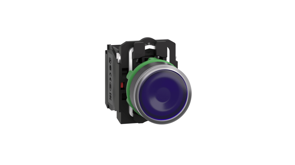 Pulsante luminoso SPDT per montaggio a pannello, diametro 22 mm, serie Harmony XB5 di Schneider Electric. Contatti: 1 N/O + 1 N/C, materiale plastico, colore blu. Range di temperatura operativa: -25 a +70 gradi Celsius, grado di protezione IP 66, IP 67 e IP 69 K. Resistenza meccanica: 10.000.000 cicli, tensione massima 240 V, tipo terminale a vite. Normative: EN/IEC 60947-5-1, UL 508. Codice produttore: XB5AW36M5.