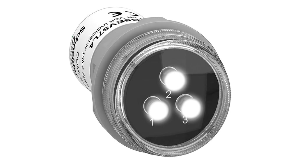 Spia LED per montaggio a pannello, diametro foro 30mm, protezione IP67, tensione nominale 400V, colore bianco, tipo lampada LED, attacco rapido, corpo in plastica, serie Harmony XB5, forma rotonda, spia monolitica trifase con doppio isolamento elettrico, progettata per applicazioni industriali e resistenza agli agenti chimici.
