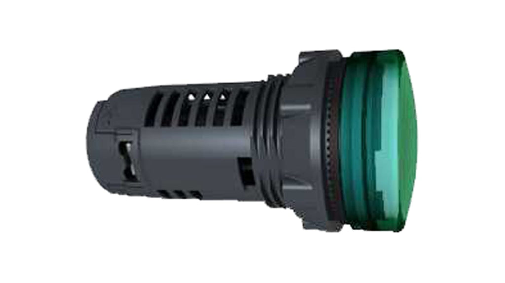 Luce pilota completa con LED integrato, tensione nominale 110 V AC, 120 V CA, corrente nominale 14 mA, colore verde, diametro foro 22 mm, montaggio a pannello, protezione IP66, tipo terminale a vite, corpo in plastica, serie Harmony XB5, spia pilota rotonda, spie monolitiche con cornice doppia isolata, progettata per applicazioni industriali.