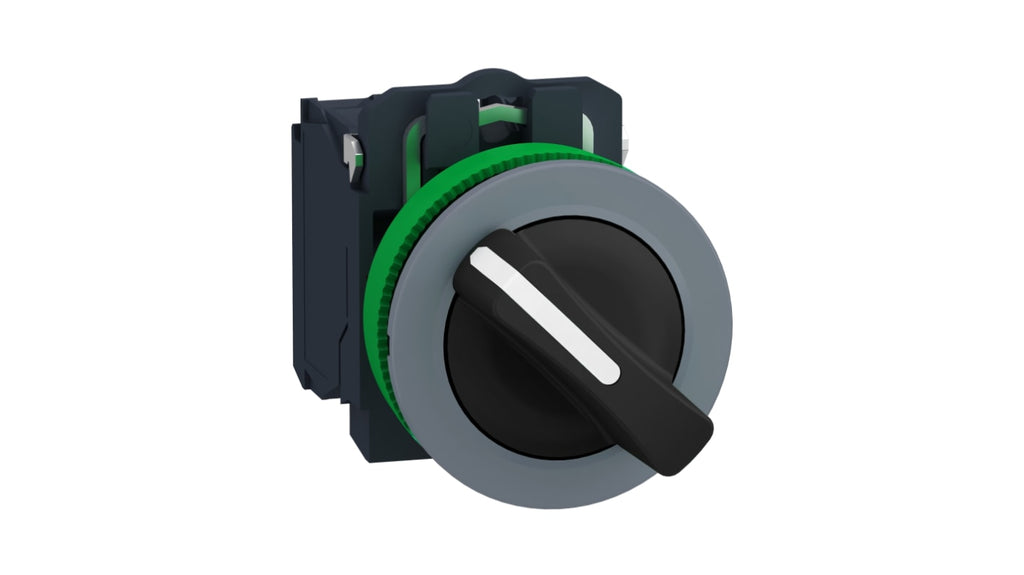 Selettore a 3 posizioni Schneider Electric, diametro foro 30.5 mm, montaggio a filo, cornice grigia, impugnatura standard nera, meccanismo di fermo, 1 contatto normalmente aperto, grado di protezione IP66 e IP67, conforme a RoHS, senza mercurio, senza metalli pesanti tossici.