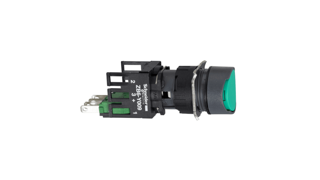Pulsante a ritorno a molla, montaggio a pannello, serie Harmony XB6. Diametro foratura pannello 16 mm, colore verde, tipo rotondo. Protezione IP65, tensione massima c.c. 250V, massima tensione c.a. 240V. Minima temperatura operativa -25°C, massima temperatura operativa +70°C. Tipo terminale attacco rapido, terminale a saldare. Codice produttore XB6AA35B.