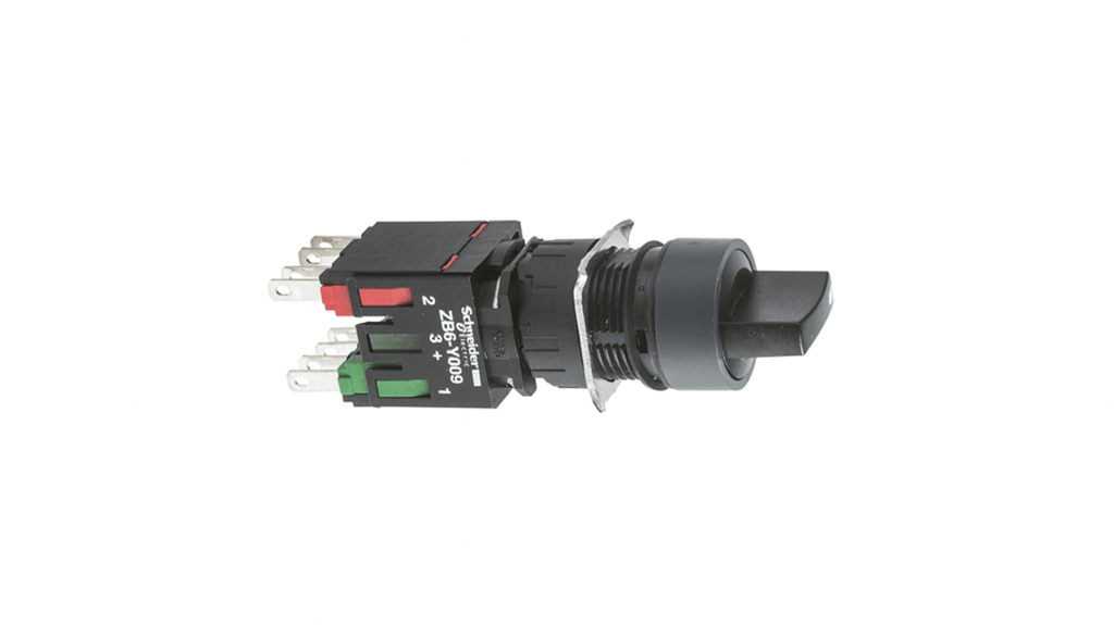 Selettore completo a due posizioni, marchio Schneider Electric, modello XB6AD225B. Costruito in plastica per maggiore durata, contatti in lega d'argento per efficienza elettrica, connettori Faston per connessioni sicure. Grado di protezione IP65, diametro pulsante 16mm, forma quadrata, colore nero. Adatto a diverse applicazioni industriali.