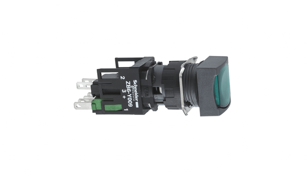 Pulsante illuminato quadrato Schneider Electric della gamma Harmony XB6, colore verde, diametro di montaggio 16 mm, attuazione a pulsante con ritorno a molla, contatti 1NO + 1NC, tensione di alimentazione nominale 12-24V, sorgente luminosa a LED, materiale dei contatti in lega d'argento, grado di protezione IP65, design a filo per facile identificazione.