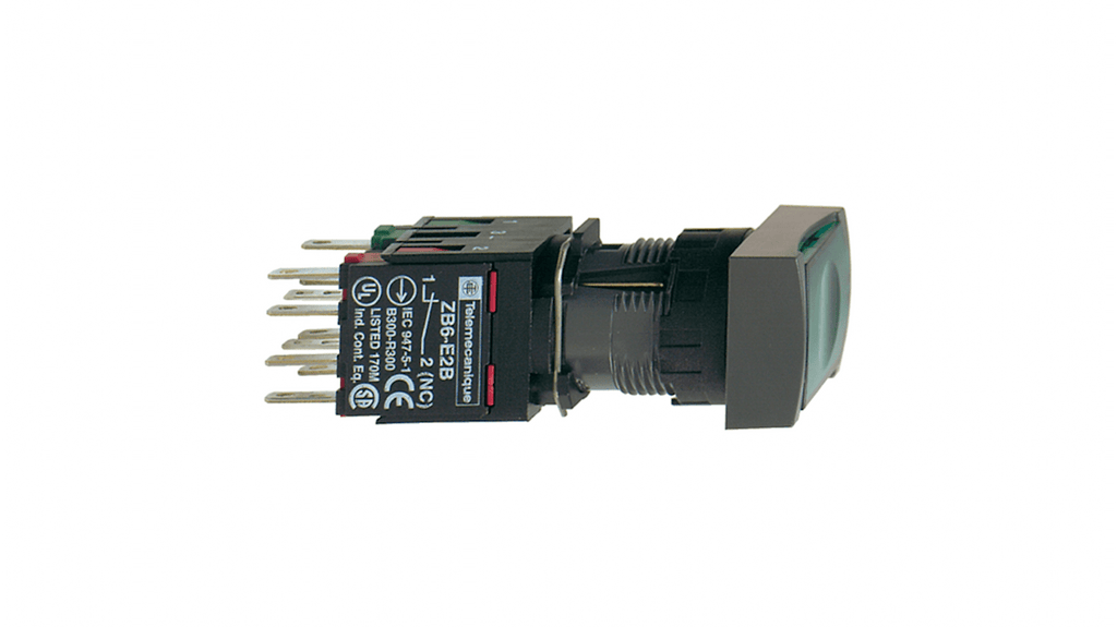 Pulsante illuminato completo Schneider Electric della gamma Harmony XB6, attuazione a pulsante, design compatto, colore verde, contatto di chiusura 1NO+1NC, diametro di montaggio 16 mm, materiale della lunetta in plastica, sorgente luminosa a LED, funzionamento del contatto a interruzione lenta, profilo dell'operatore a filo senza segni di riconoscimento.