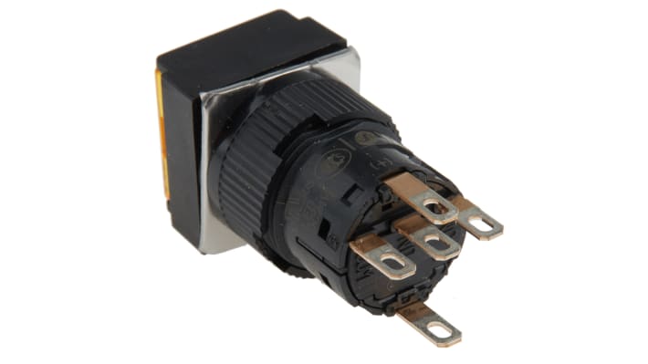 Pulsante luminoso SPDT per montaggio a pannello, grado di protezione IP65, serie Harmony XB6E. Dimensioni foratura pannello 16 mm, colore giallo, attacco rapido, terminale a saldare. Tensione massima 110 V CC, massima tensione CA 250 V, temperatura operativa da -25 a +55 gradi Celsius. Resistenza meccanica 1.000.000 cicli, conforme a EN/IEC 60947-5-1 e UL 508. Codice produttore XB6ECW5B1P.