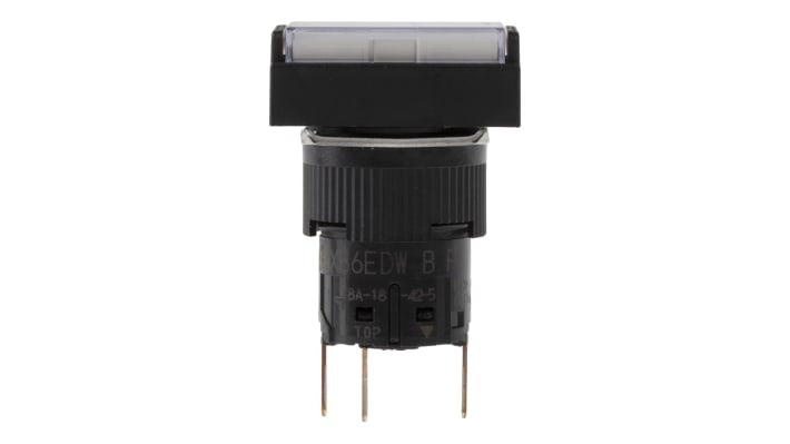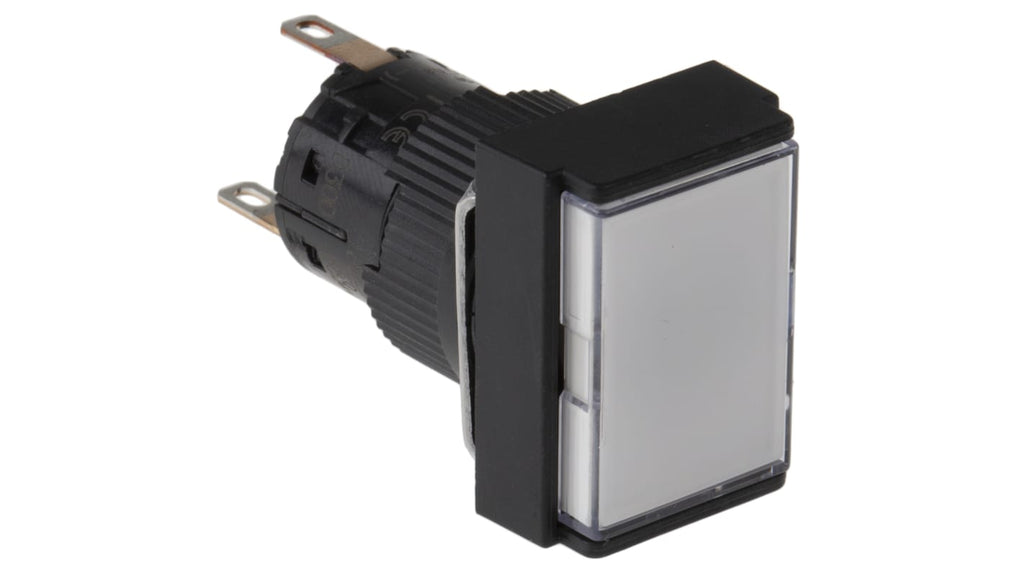 Pulsante luminoso a montaggio a pannello, SPDT, serie Harmony XB6E, codice XB6EDW1B1P. Grado di protezione IP65, resistenza meccanica 1.000.000 cicli, temperatura operativa da -25 a +55 gradi Celsius. Colore bianco, attacco rapido, terminale a saldare. Tensione massima c.c. 110V, massima tensione c.a. 250V. Materiale plastico resistente a liquidi, forma rettangolare. Conforme a EN/IEC 60947-5-1, UL 508.