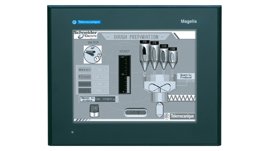 Display HMI touch screen, Magelis XBT GT, 5,7 pollici, risoluzione 320 x 240 pixel, tipo display STN, retroilluminazione, CPU RISC 133 MHz, memoria onboard 16 MB, porte Ethernet (RJ45) e USB, grado di protezione IP20 e IP65, temperatura operativa da 0 a 50 gradi Celsius, dimensioni 167,5 x 135 x 59,5 mm, alimentazione 24 V c.c.
