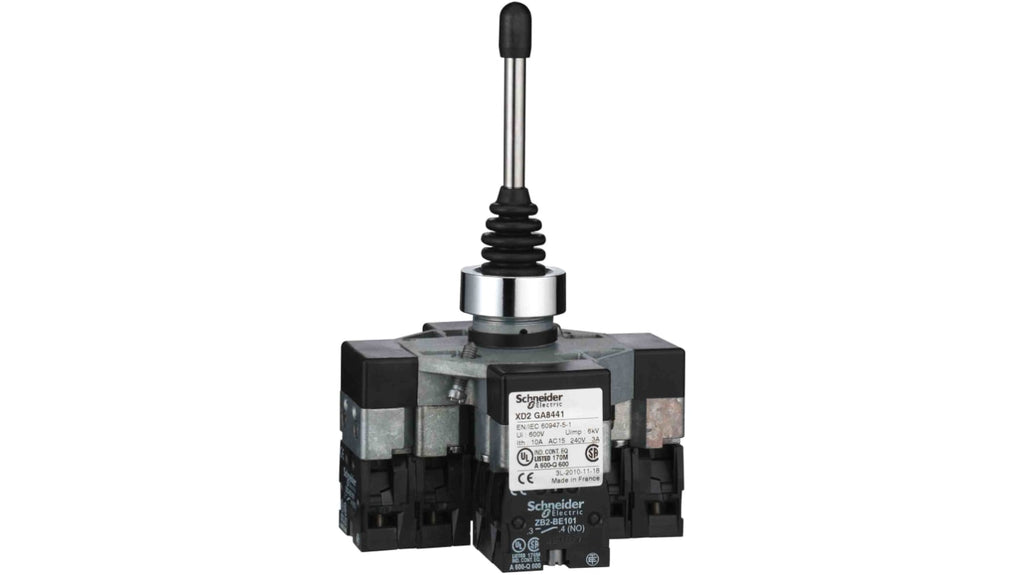 Interruttore joystick Schneider Electric con diametro 22 mm, 4 assi, protezione IP66, materiale in metallo cromato. Tensione nominale contatto 240V, corrente nominale contatto 3 A, configurazione contatto SPDT. Range di temperatura operativa da -25 a 70 gradi Celsius. Protezione contro il contatto accidentale.