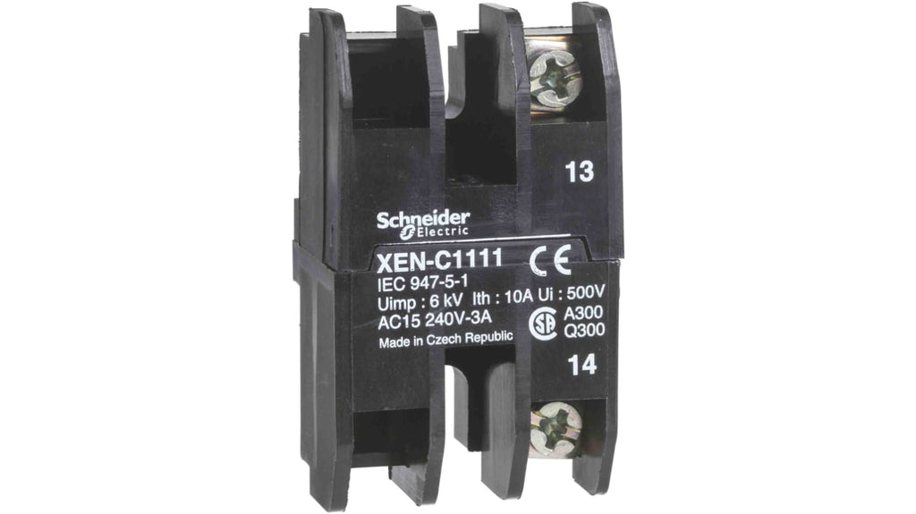 Blocco contatti Schneider Electric, 1 NC + 1 NA, tensione nominale 240V, tipo terminale a vite. Prodotto privo di mercurio, sbraccio senza SVHC, garanzia 18 mesi. Utilizzato per attivare o disattivare circuiti elettrici, compatibile con interruttori e relè. Serie XEN.