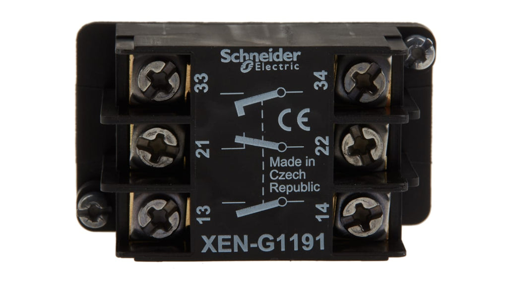 Blocco contatti Schneider Electric, 2NA + 1NC, tensione nominale 600V, corrente nominale 10A, montaggio frontale, tipo terminale a vite, durata meccanica 1000000 cicli, protezione da cortocircuito con fusibile da 10A, progettato per applicazioni a 2 velocità con ritorno a molla, resistenza a vibrazioni e urti, adatto per circuiti di controllo in ambienti industriali.