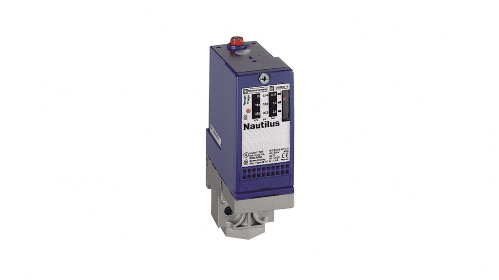 Sensore di pressione differenziale elettromeccanico. Differenziale fisso, pressione minima di lettura -0.76bar, pressione massima di lettura -0.04bar, precisione 2%, fluido misurato: aria, acqua dolce, olio idraulico. Collegamento al processo G1/4, tensione di alimentazione 500 V, temperatura operativa da -25 a 70 gradi Celsius, grado di protezione IP66. Codice costruttore XMLAM01V2S12, marchio Schneider Electric.
