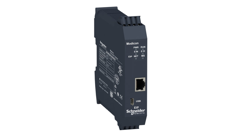 Modulo di espansione per comunicazioni Schneider Electric, serie XPSMCMCO, codice XPSMCMCO0000EIG. Collegamento IP Ethernet 1 con connettore RJ45, progettato per monitoraggio remoto del sistema di sicurezza tramite protocollo Ethernet/IP, senza necessità di gateway aggiuntivi. Dotato di morsetti a molla e morsettiera rimovibile. Tensione di alimentazione 24 V. Flessibilità e scalabilità integrate.