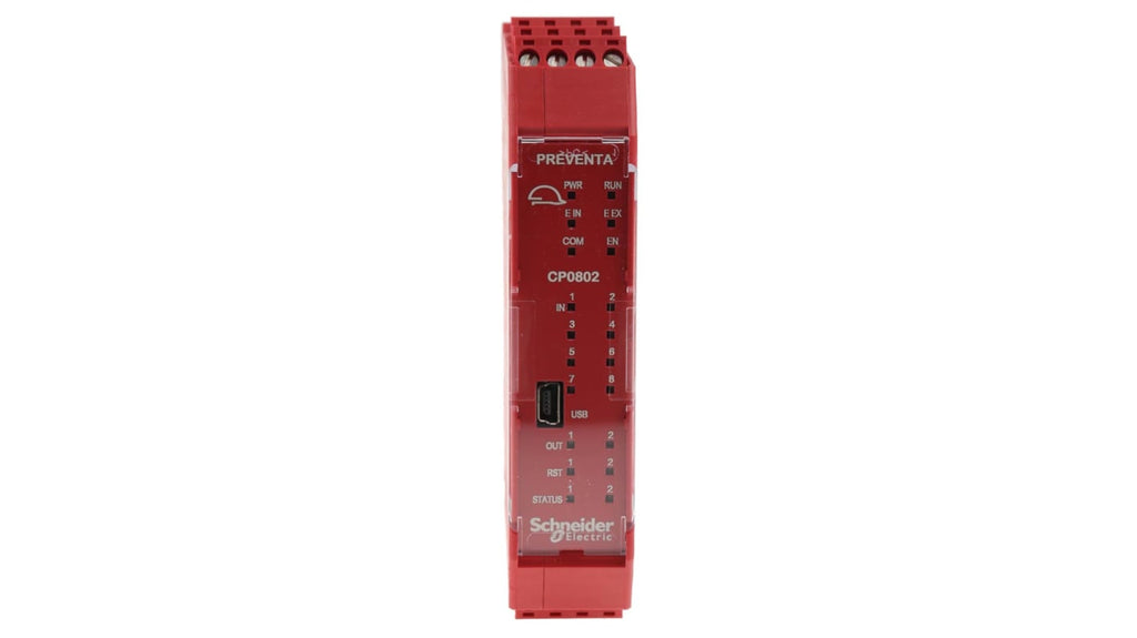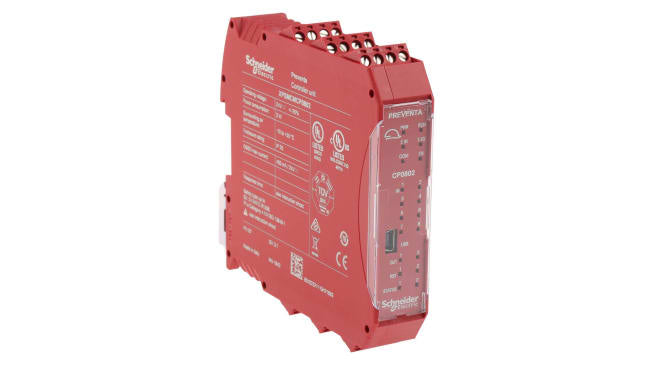 Controller di sicurezza modulare Preventa, 18 I/O, 8 ingressi digitali di sicurezza, 2 uscite di sicurezza, SIL 3, Tipo 4, conforme a IEC 62061 e EN/ISO 13849-1, comunicazione Ethernet IP, Modbus TCP, USB, alimentazione 24 V c.c., corrente nominale 400 mA, dimensioni 22,5 x 99 x 114,5 mm, grado di protezione IP20, contenitore compatto rosso, espansione disponibile.