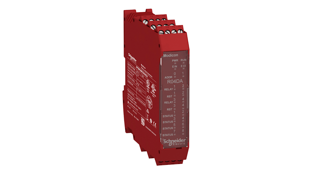 Modulo d'uscita relè di sicurezza per guida DIN, 24 V c.c., 4 ingressi, 12 uscite, potenza nominale 3 W, design compatto 22,5 x 99 x 114,5 mm, morsettiere a vite rimovibili, clip di bloccaggio per guida DIN simmetrica, conforme RoHS, prodotto Green Premium, certificazione TUV SUD Cat. 4, PLe secondo EN/ISO 13849-1, SILCL 3 IEC/EN 61508.