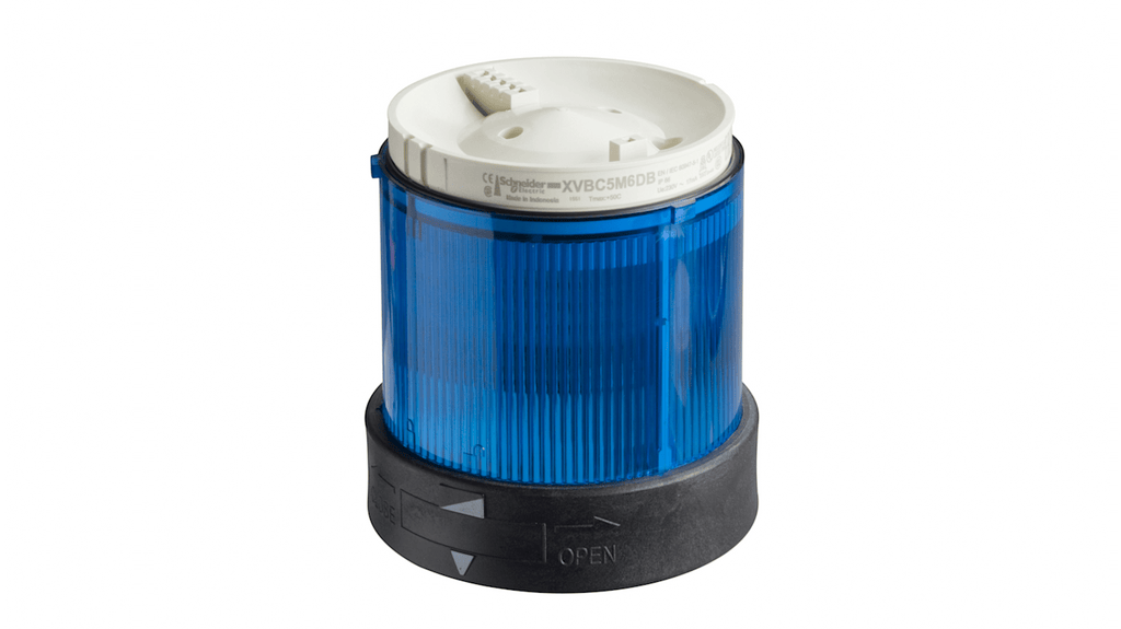 Segnalatore illuminato a LED blu. Tensione di alimentazione 24 V, grado di protezione IP65. Materiale in policarbonato, temperatura di conservazione da -40 a 70 gradi Celsius. Tipo di corrente alternata e continua, effetto luce fisso. Serie Harmony XVBC, gruppo indicatore.