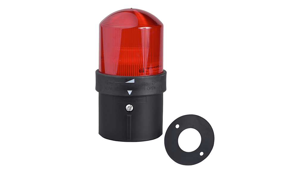 Segnalatore fisso LED rosso. Tensione di alimentazione 120 V c.a., grado di protezione IP65, materiale in policarbonato. Temperatura ambiente da -40 a 70 gradi Celsius. Montaggio su base, tipo lampadina LED, serie XVBL.