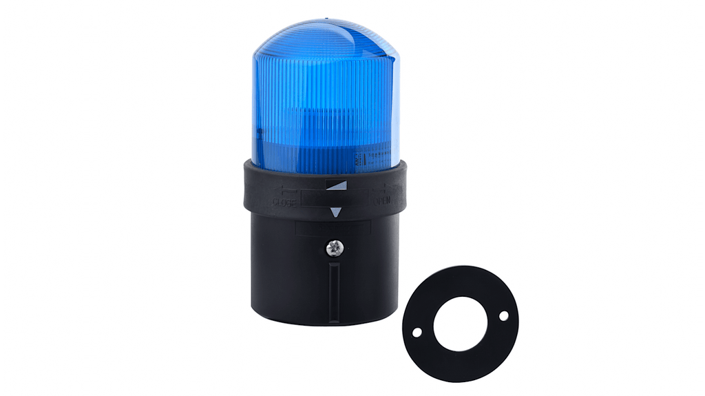 Segnalatore illuminato a LED blu. Marchio Schneider Electric, modello XVBL0M6. Tensione di alimentazione 230 V c.a., grado di protezione IP65. Materiale in policarbonato, temperatura di conservazione da -40 a 70 gradi Celsius. Tipo di componente: beacon completo, effetto luce fisso.