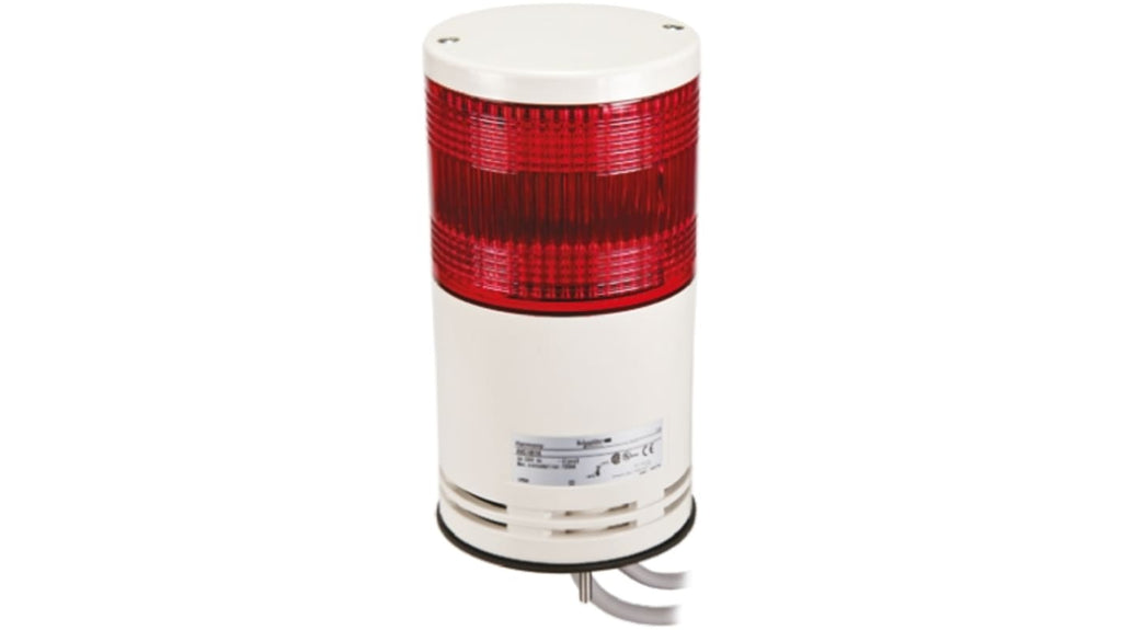 Torretta di segnalazione preconfigurata, 24 V c.c., LED, 1 elemento, lenti rosse. Diametro 100 mm, altezza 216 mm, montaggio superficiale. Illuminazione fissa o lampeggiante, consumo di corrente 100 mA. Temperatura operativa da -30 a +50 gradi Celsius. Cavo di collegamento lungo 500 mm, custodia bianca. Multifunzione, pronta per l'installazione. Codice costruttore: XVC1B1K, marchio: Schneider Electric.
