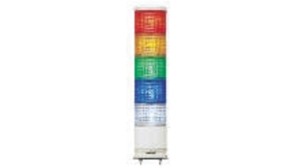 Torretta di segnalazione preconfigurata, 24 V c.a. / c.c., 5 elementi luminosi LED, lenti Rosso/Verde/Ambra/Blu/Trasparente, montaggio superficiale, altezza 280.8 mm, diametro base 60 mm, consumo di corrente 125 mA, lunghezza cavo di collegamento 850 mm, temperatura operativa da -10 a +50 gradi Celsius, standard EN/IEC 61000-6-2, EN/IEC 61000-6-3, EN/IEC 61000-6-4, classe I, marchi CE, UL, CSA, CCC, GOST in corso.