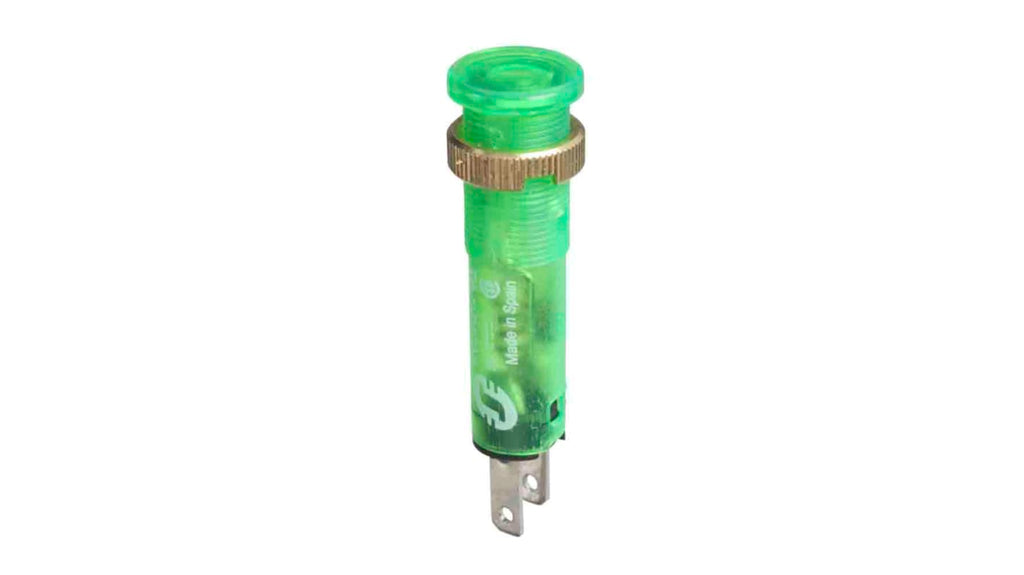Spia LED verde con diametro foro 8mm, tensione nominale 12V, corrente nominale 18mA, grado di protezione IP40/IP65 con guarnizione, tipo di lampada LED, collegamento faston, serie Harmony XVL, priva di mercurio.
