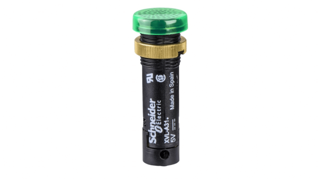 Spia LED montaggio a pannello, diametro foro 12mm, tensione nominale 24V cc, colore verde, grado di protezione IP40 e IP65 con guarnizione XVL, conforme a standard IEC 947-1, IEC 947-5-1, IEC 947-5-4, EN 60947-5-1. Cornice in plastica, coperchio integrato, collegamento mediante viti e staffe, serie Harmony stile 7, compatta e facile da installare.