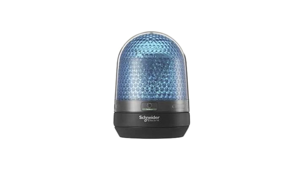 Segnalatore lampeggiante rotante a LED, blu, tensione di alimentazione 100-230 V c.a., montaggio su base, grado di protezione IP23 e IP65, resistenza alle vibrazioni 7,1 G, temperatura operativa da -10 a +50 gradi Celsius, dimensioni base 100 mm, altezza 139 mm, custodia nera, lampada inclusa, serie Harmony XVR, multifunzionale, ingresso di tensione flessibile, selettore di modalità luce. Certificazione CE, conforme alla direttiva RoHS.
