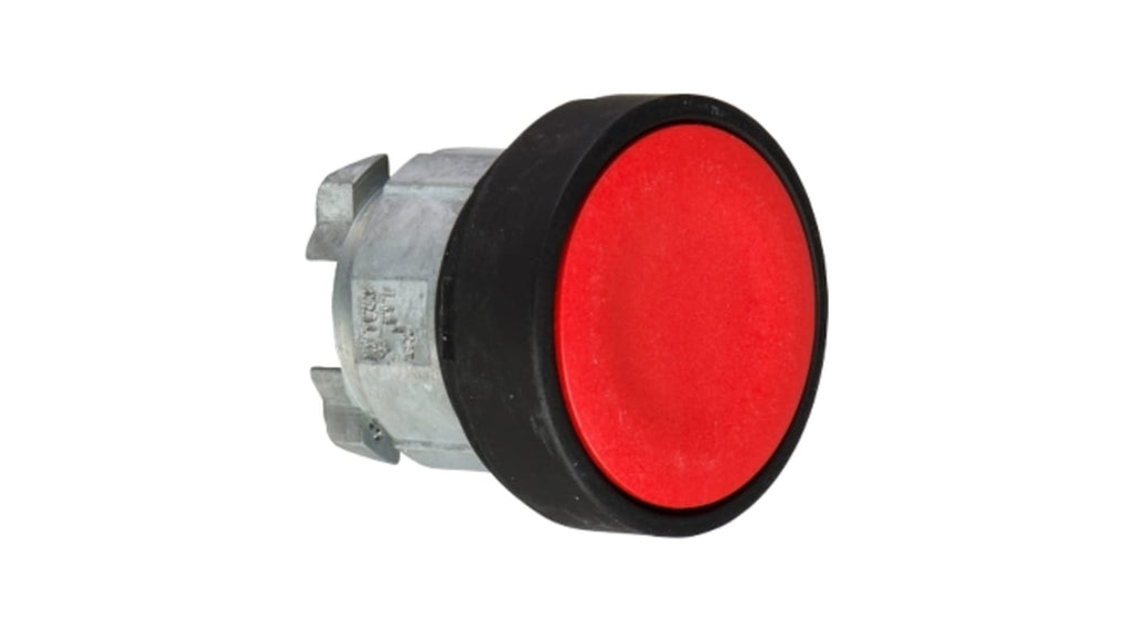 Attuatore pulsante tipo Instabile, serie Harmony XB4, Schneider Electric. Testa rotonda, diametro foro 22mm, diametro pulsante 28.5mm, colore rosso, materiale metallo privo di cromo, ritorno a molla. Grado di protezione IP66, IP67, IP69K.