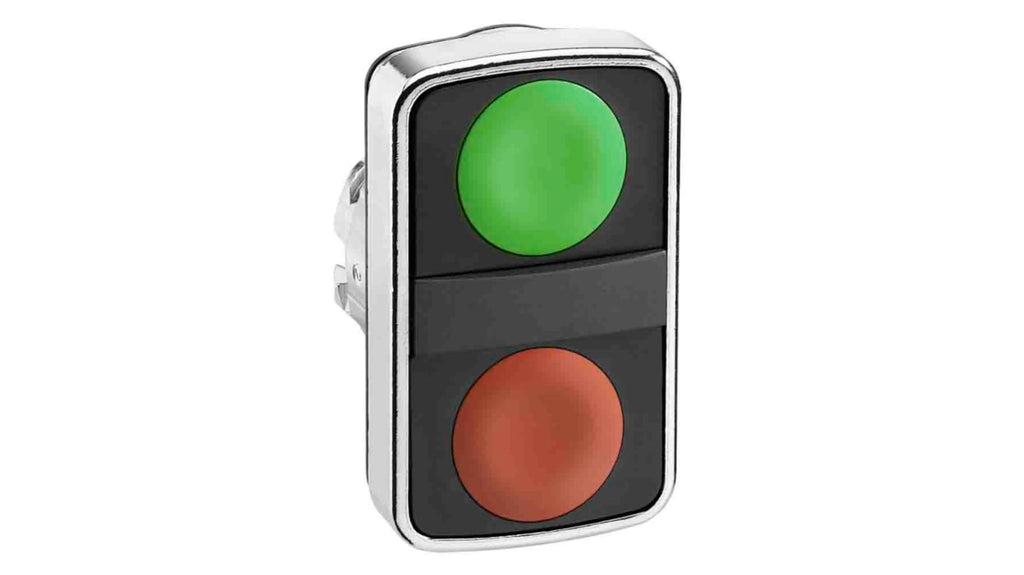 Attuatore pulsante tipo Instabile, Schneider Electric Harmony XB4, a doppia testa con 1 pulsante verde e 1 pulsante rosso, meccanismo di ritorno a molla, diametro foro 22mm, forma rettangolare, grado di protezione IK06 conforme a IEC 50102, facile installazione e sostituzione su unità a pulsante complete compatibili e blocchi di contatti tramite assemblaggio a innesto.