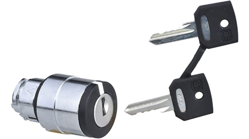 Testa selettore a 3 posizioni Schneider Electric serie XB4, modello ZB4BG1, con ritorno a molla, serratura a chiave Ronis 455, diametro foro 22 mm, materiale in metallo cromato, grado di protezione IP66.